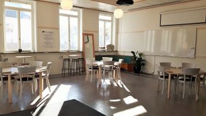 Kollaboratoriet is located in central Uppsala, overlooking the Fyris river. The space is designed for activities with up to 40 people and you have access to 77 square meters of area. It has flexible furniture options, with most furniture able to be removed or added as needed, depending on the the activity.